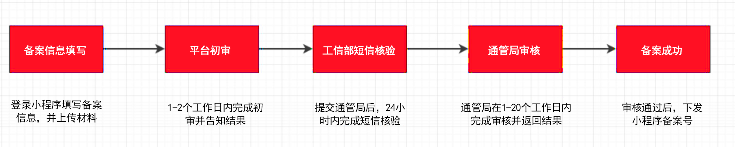 備案整體流程總共分為五個(gè)環(huán)節(jié):備案信息填寫(xiě)、平臺(tái)初審、工信部短信核驗(yàn)、通管局審核和備案成功。