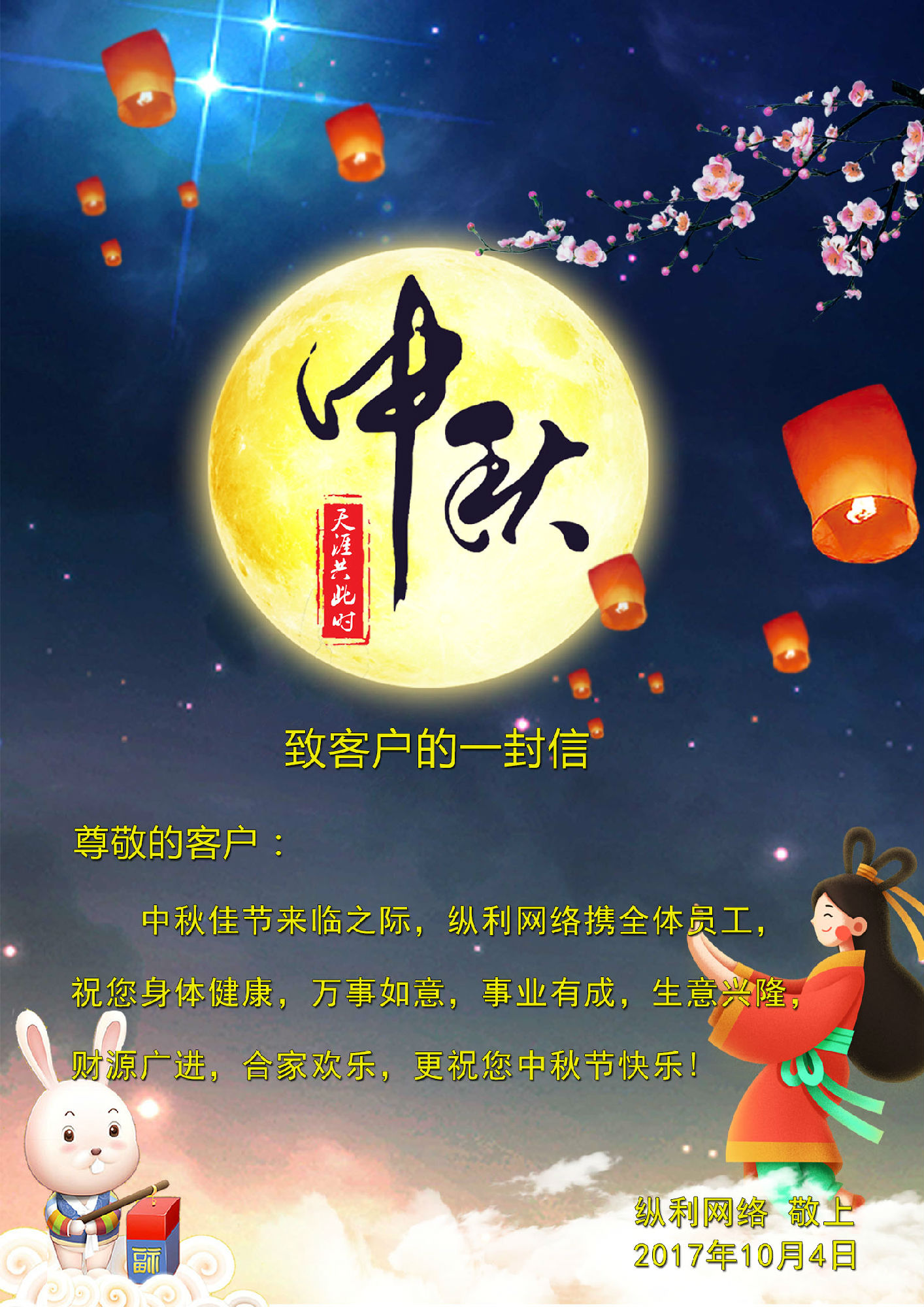 中秋佳節(jié)來臨之際,縱利網(wǎng)絡(luò)攜全體員工,祝您身體健康,萬事如意,事業(yè)有成,生意興隆,財(cái)源廣進(jìn),合家歡樂,更祝您中秋節(jié)快樂!